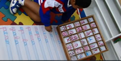 Lenguaje: la mente en la 1era. Infancia absorbe el conocimiento, a los 2 años habla el idioma de sus padres sin que nadie se lo haya enseñado. A los 4 años pasa sus dedos por la silueta de las letras talladas identifica la forma del fonema, comprende la formación de las palabras, de ese modo se va instruyendo asimismo y la escritura y lectura se da como algo repentino similar a la aparición del Habla. Así, sin presiones con espontaneidad va desarrollando el lenguaje oral, la escritura y la lectura total y su extensión: geografía, biología, arte, historia, etc.